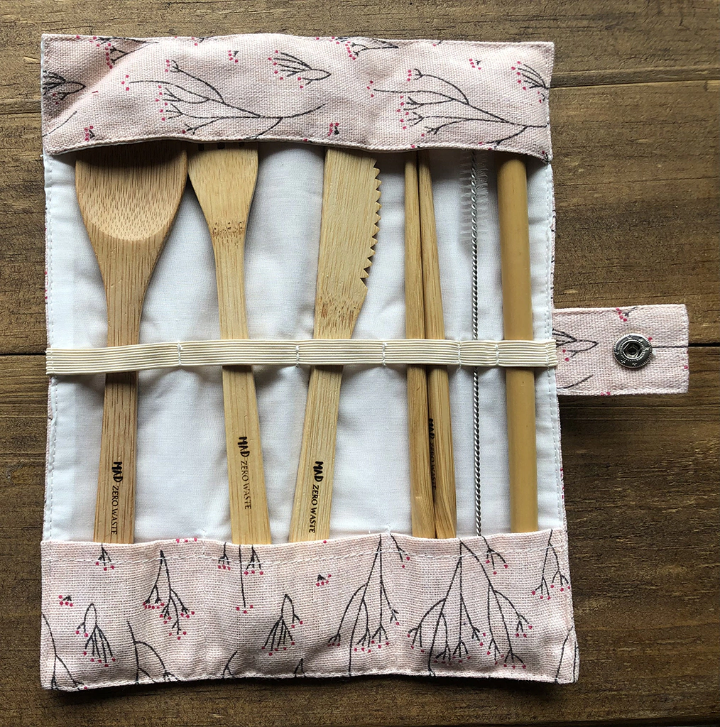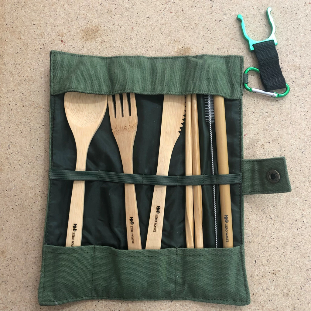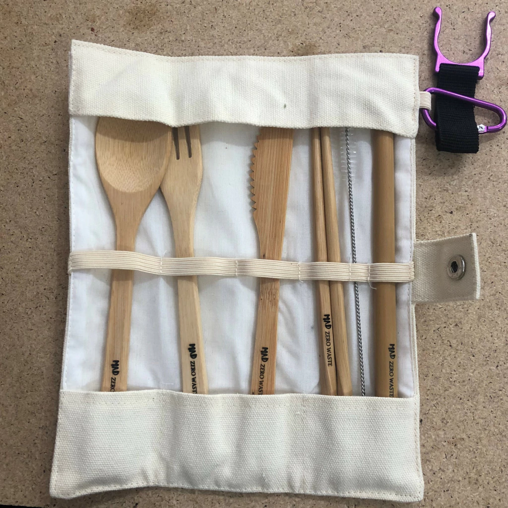 Cubiertos y popote de bambú. Cada kit incluye tenedor, cuchara, cuchillo, palillos, popote de bambú y pipeta. Vienen en un estuche de tela de algodón para guardarlos fácilmente.